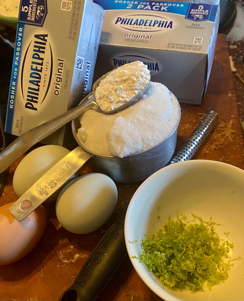 I baked the crust and moved on to the cheesecake part. First I gathered my ingredients.
