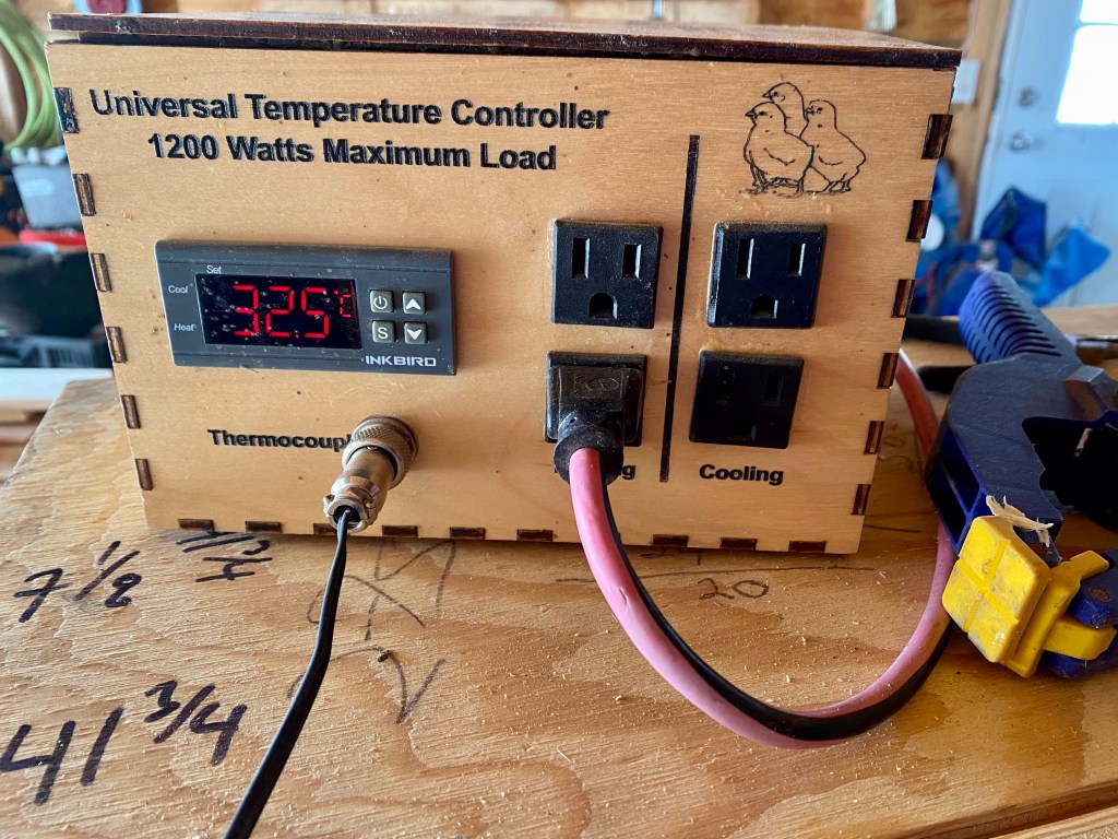 Not quite up to temp yet. The Husband built the temperature controller. But they seem pretty happy.
