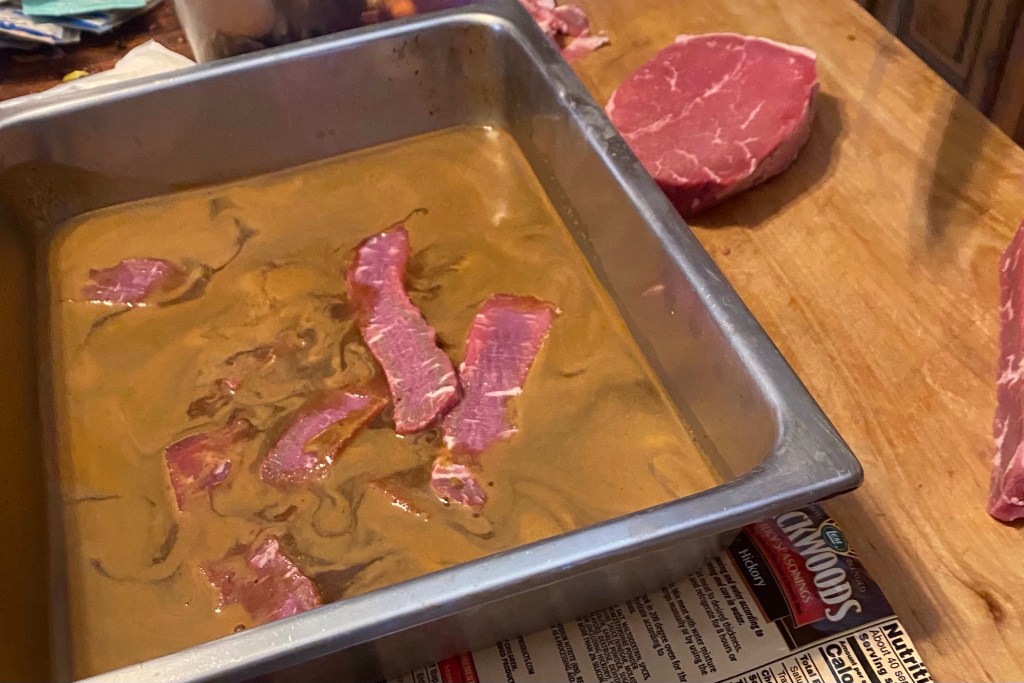 Started off with the cure and marinade. mixed that with water, and sliced the meat into thin strips. We put them in the marinade overnight.