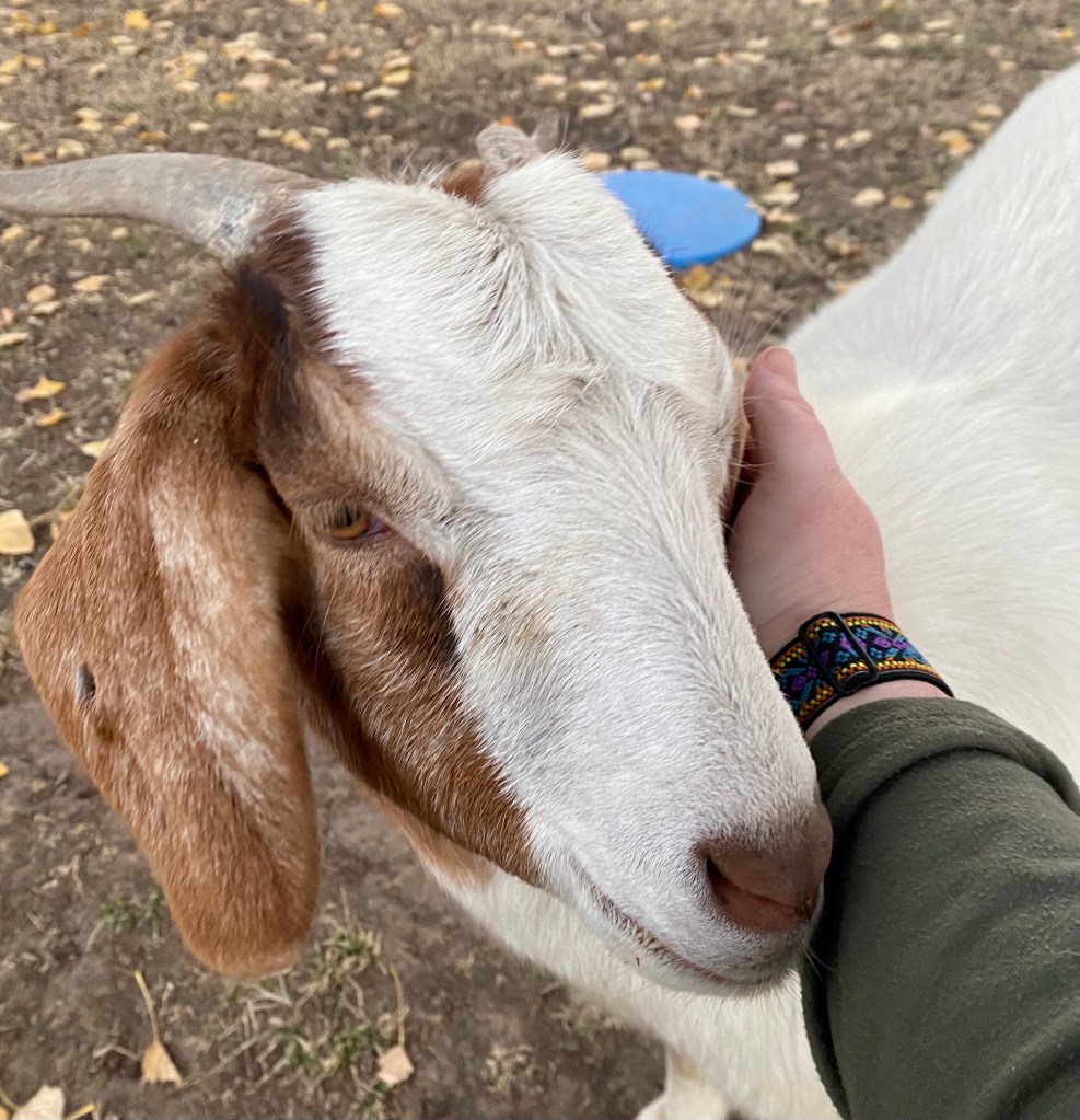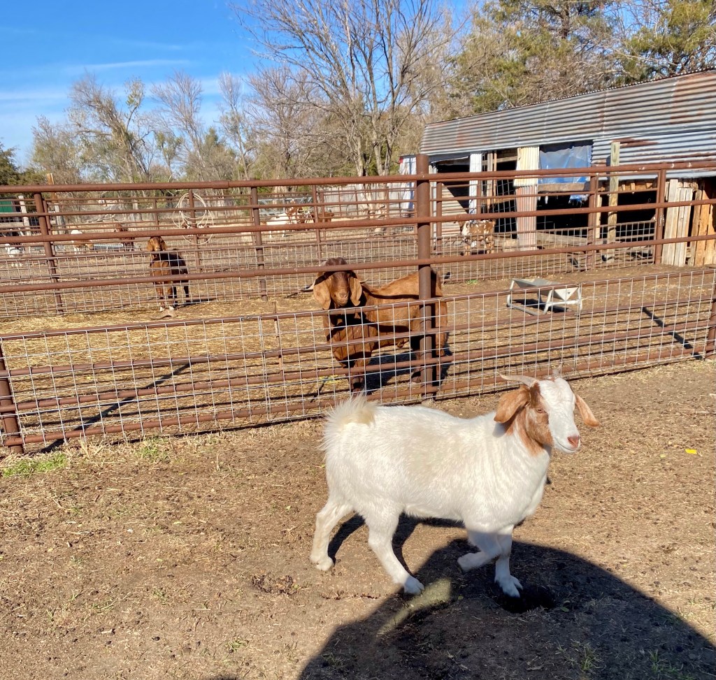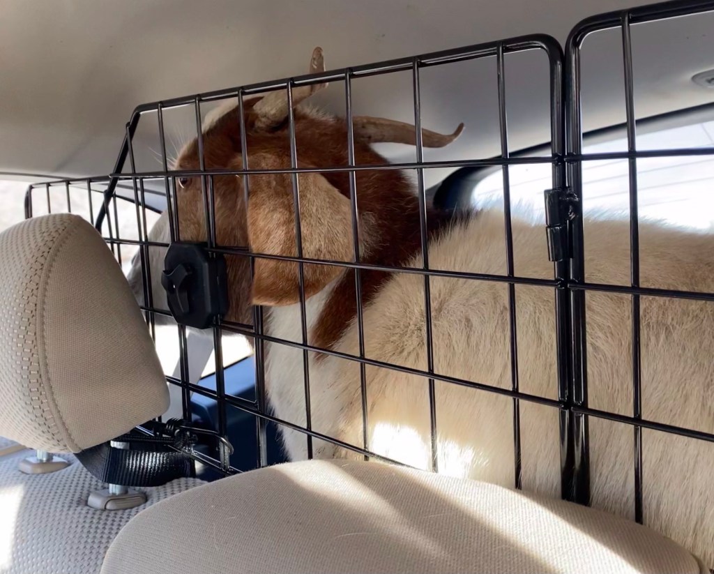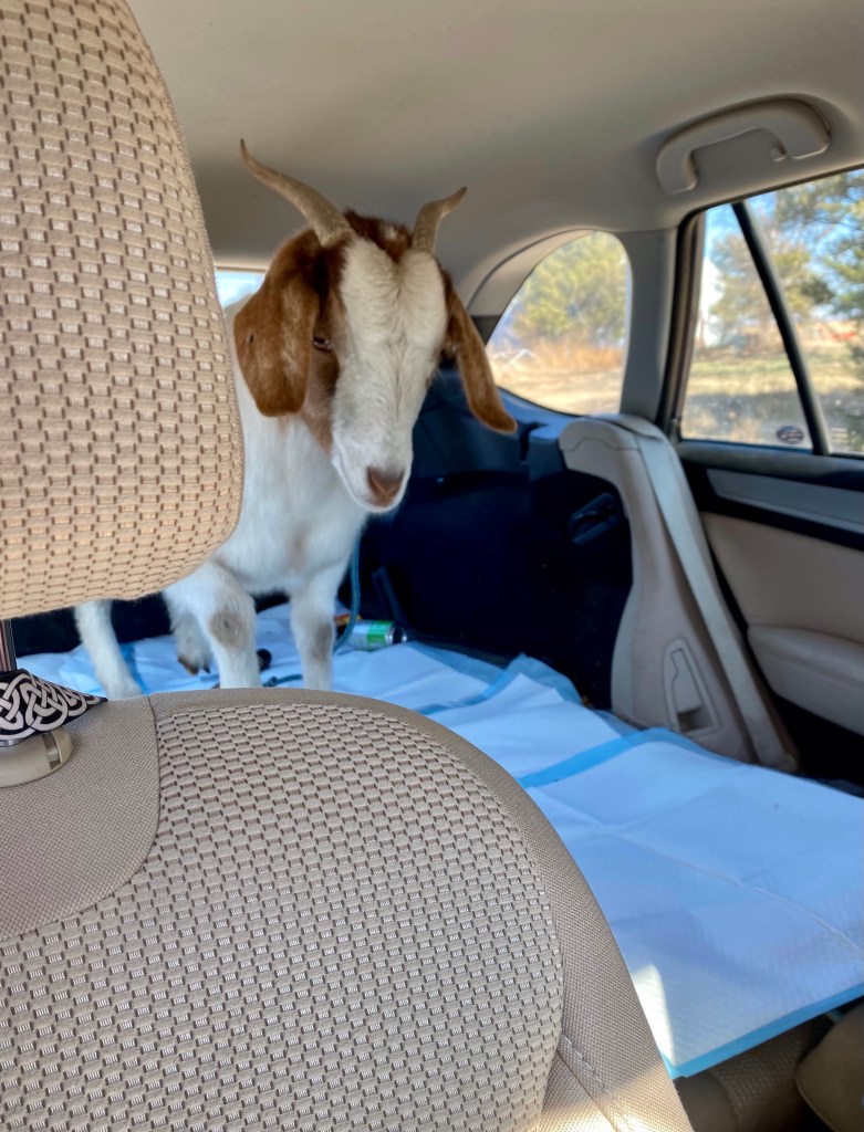 We get her in the pen, and leave. And wait… and wait. So three weeks later, our goat guy messages and says we can pick her up.