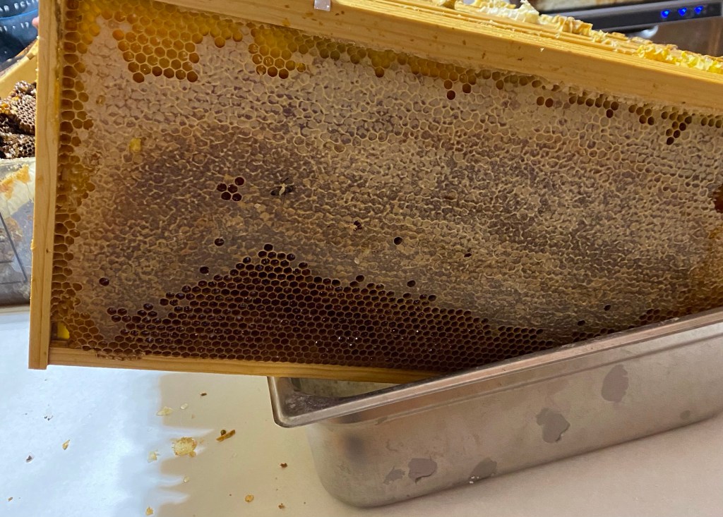 We use metal bench knives to scrape off the honey/comb. A bowl of hot water helps. This time, I tried to get some comb honey with moderate success.