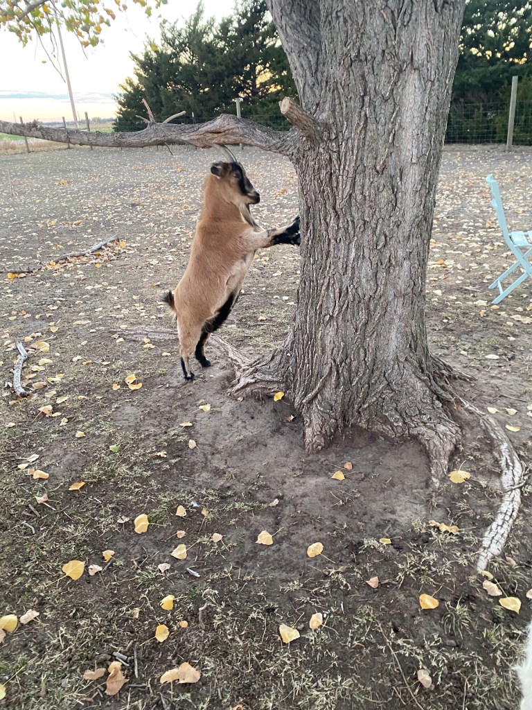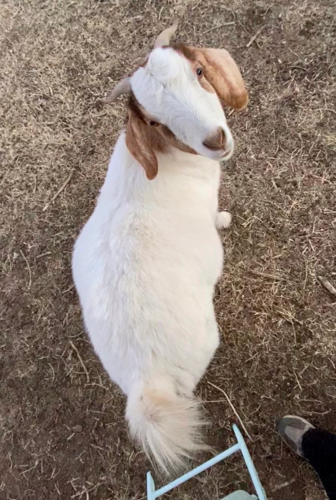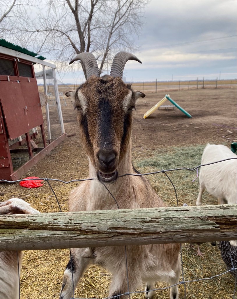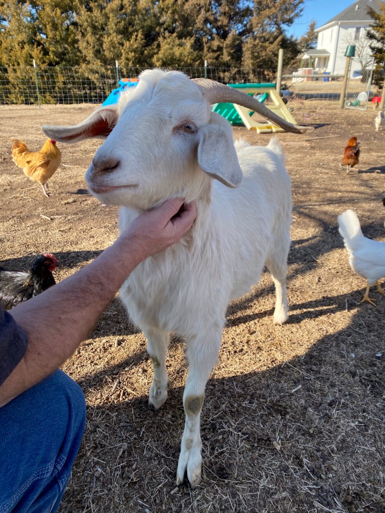 We start with the goats. Our oldest is Violet. She smiles a lot, and is veeeerrryy slowly learning that she can be pet without dying.