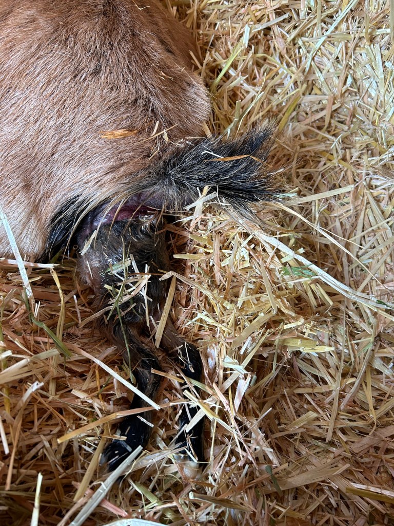 So when I was done with my meeting, I went out to check on her. Um… there was a hoof sticking out of her hoo ha. So all of our meticulous planning was out the window, because I was by myself, it was snowy, icy, and cold, so I didn’t trust myself getting the entire tote out to the shed. So I run inside, call the Husband to come home now.