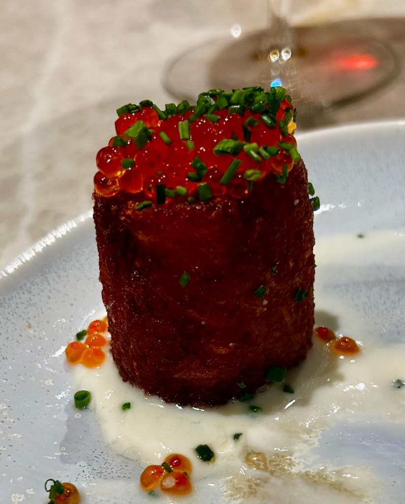 Tater tot with trout roe, crème fresche, and chive.
